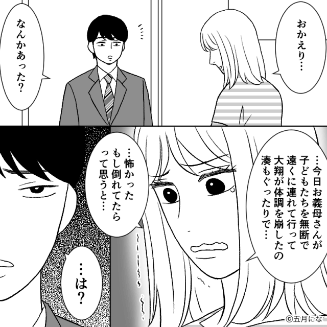 病院に駆け込むと、次男は軽い脱水症状とお腹の不調と診断されました。 義母を信用できなくなった主人公は「今後子どもたちをあなたに預けることはありません」と伝えます。