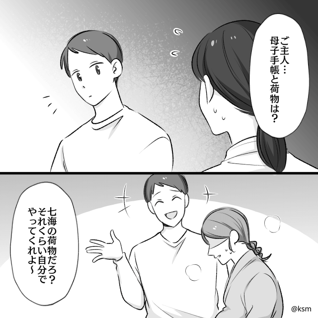 買い物帰りに破水してしまい、慌てて夫を呼んだ主人公。 しかしパチンコ中の夫は来てくれず、主人公は「荷物忘れないでね」と伝えてタクシーで病院に向かいます。