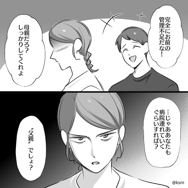 数分後「やっぱ俺子育て向いてないわ!」と投げ出した夫は、娘をどこかに預けようと信じられない提案をしてきます。 それから3ヶ月後、娘が体調を崩すと、夫は主人公のせいにしてきて…。