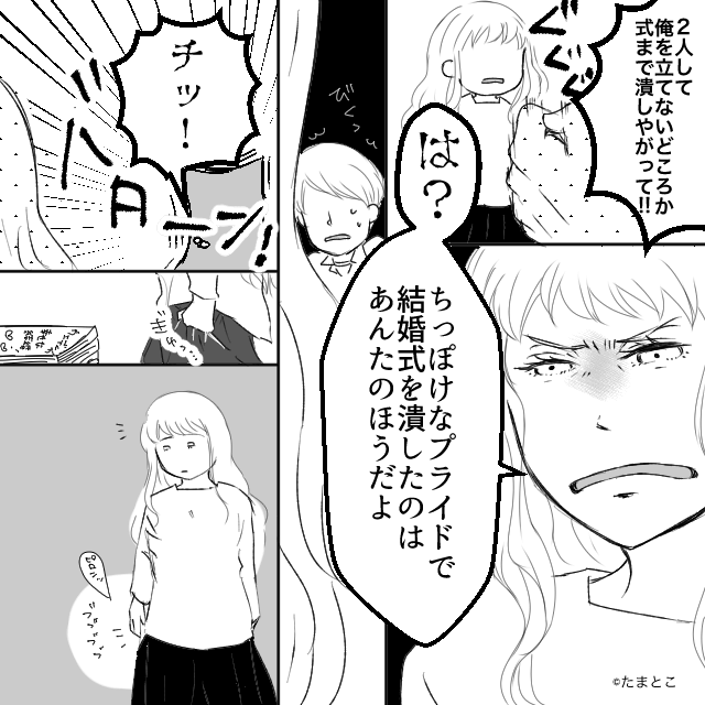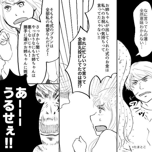 妹も妹の婚約者も不機嫌なまま、式は行われ…。 その後、2人は言い合いをして、婚約者は「俺はお前の姉ちゃん嫌いなんだよ!」と本音を打ち明けます。