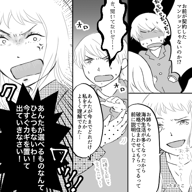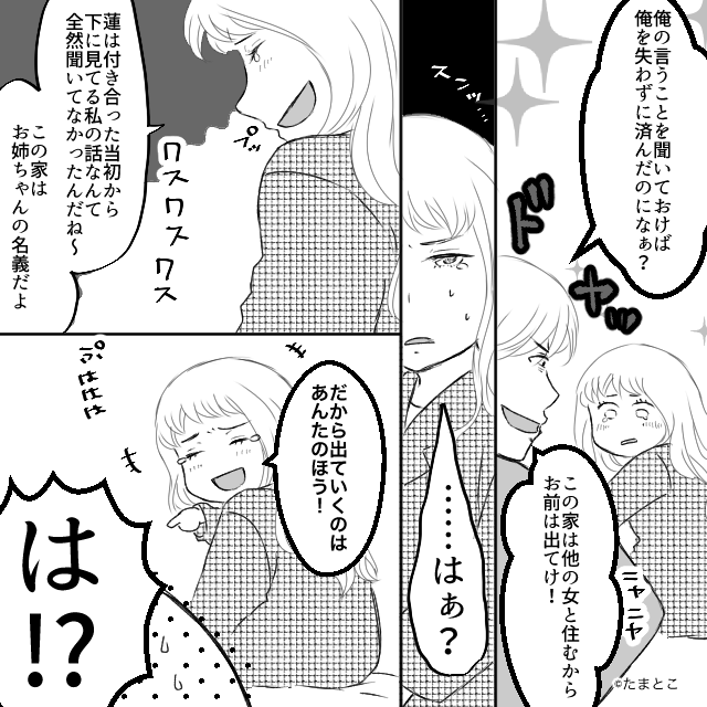 開き直った妹の婚約者は、妹との婚約はメリット目当てであり妥協だったと自白します。 そして「お前は出てけ!」と妹を追い出そうとするのですが、実は家は主人公の名義で…。