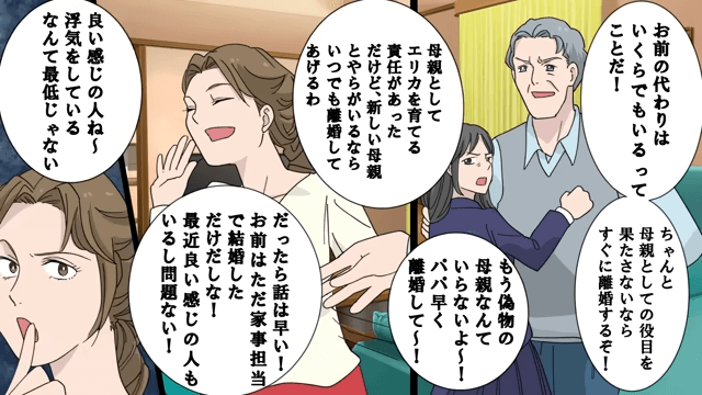 夫は娘に「パパがもっと素敵なお母さんをすぐに見つけてきてやるからな!」と言いました。 それを聞いた主人公が「浮気をしているなんて最低じゃない」と言うと、夫は「娘を泣かすお前のほうが最低だ!」と言い返して…。