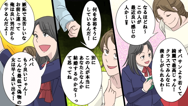 今回は『娘「偽物の母親は卒業式に来るな(笑)」私「はーい」⇒中学卒業式の当日に姿を消した結果』を紹介します。 夫は家事をしてもらうために主人公と結婚しただけで、最近はほかに親しくしている人がいると言いました。 それを聞いた主人公が「浮気をしているなんて最低じゃない」と言うと、夫は「娘を泣かすお前のほうが最低だ!」と言い返して…。