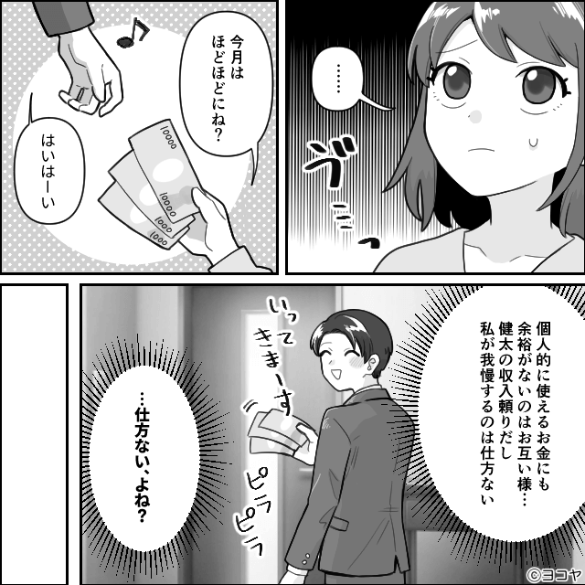 家計に余裕がなく、生活費を削ってなんとか家族3人で暮らしている主人公。 パートをしていますが、夫の収入に頼って生活していました。