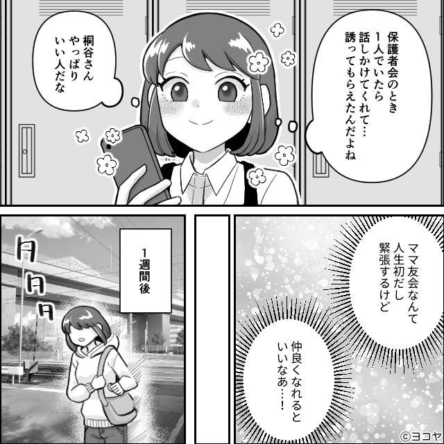 それから数日後、主人公はママ友に誘われ、初めてのママ友会に参加するのですが…。