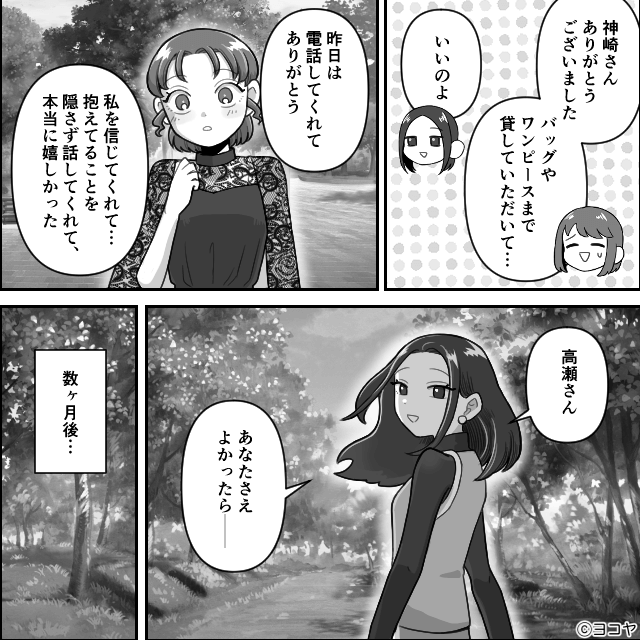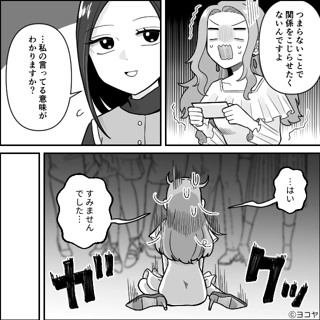 そして女性が「つまらないことで関係をこじらせたくないんですよ」と伝えると、ママ友はへたり込んで謝罪をしたのでした。