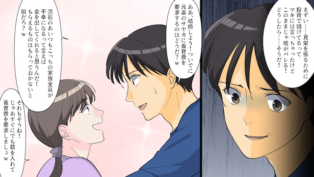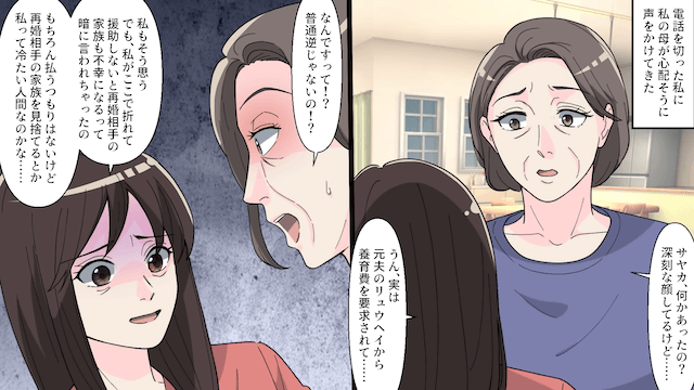 主人公を心配した母は「私に任せてちょうだい!」と言い、助っ人を呼んでくれました。 その助っ人とは再婚相手の母親で、話し合った結果、一緒に元夫と再婚相手に反撃することになったのです。