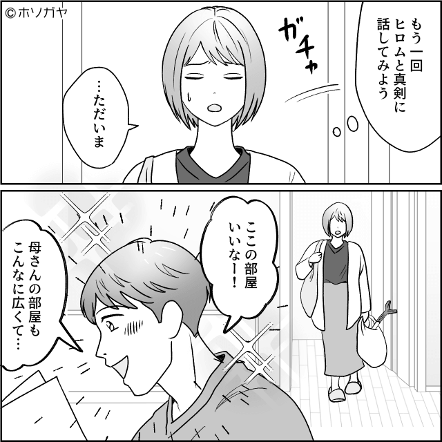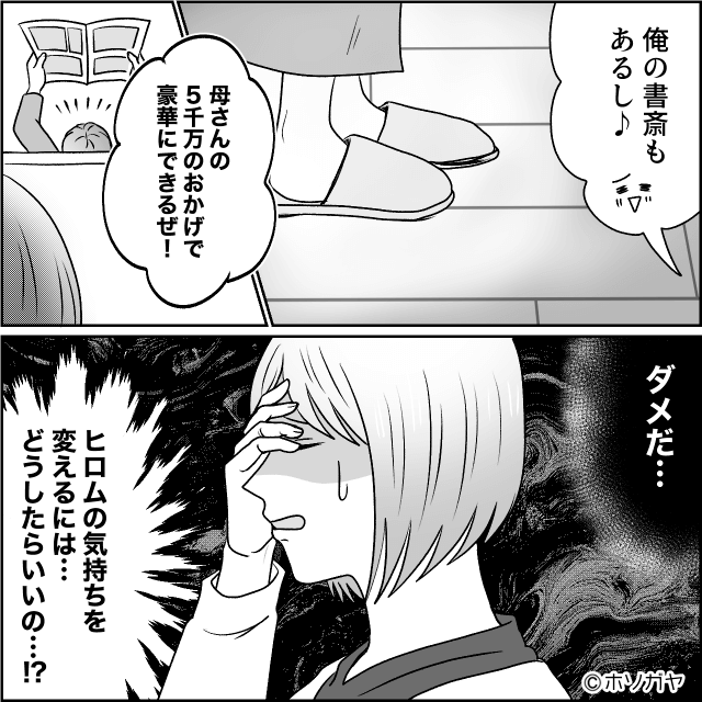 離婚を考えるものの、お金の問題や娘の気持ちを考えると決断できないでいた主人公。 夫と話し合いをしようとしますが、新居に大喜びの夫を見て、主人公は困り果てるのでした。