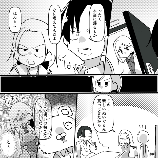 義母は新しいぬいぐるみを息子にプレゼントするのですが、息子は「いらない」と拒絶するのでした。