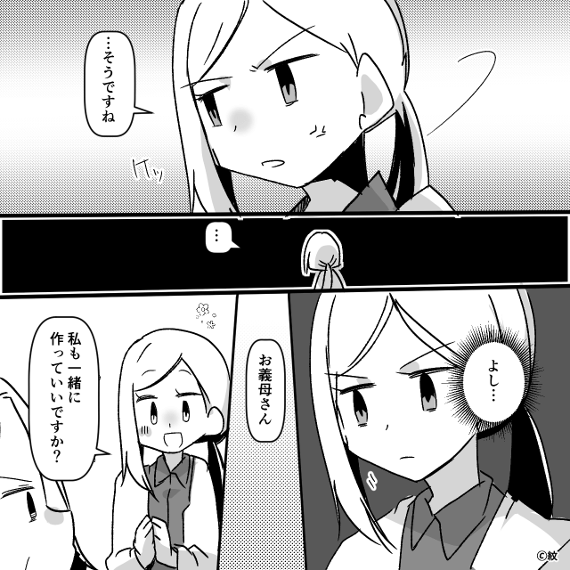 「母親がこんなのだから子どもも素直に育たないのよ!」と主人公を責め、そこから主人公の家事にも文句を言い始めた義母。 そして義母は「そうだわ!今日は私が料理作るわ!」と言い出し、食事の用意を始めます。