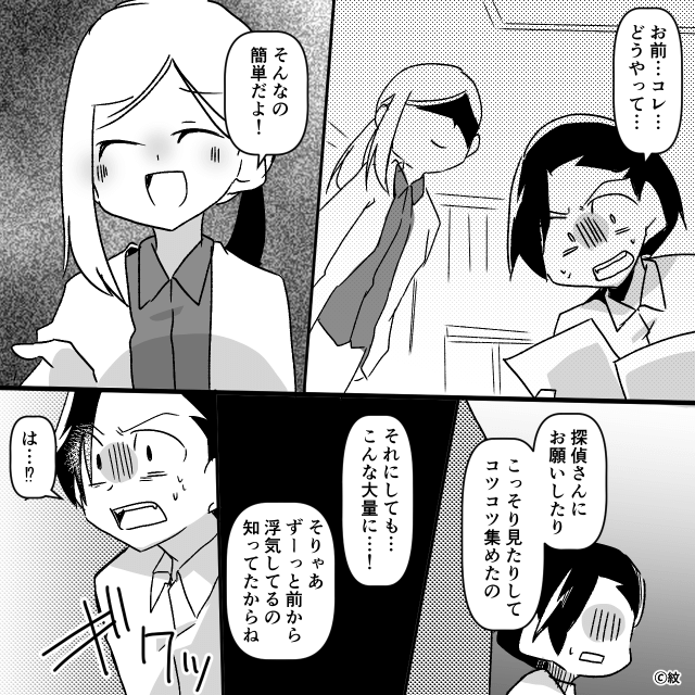 今回は『モラハラ義実家に帰省して、速攻帰宅したワケ』を紹介します。 大量の浮気の証拠を、夫に突きつけた主人公。 すると夫は青ざめ「…これは…!」としどろもどろになったのでした。