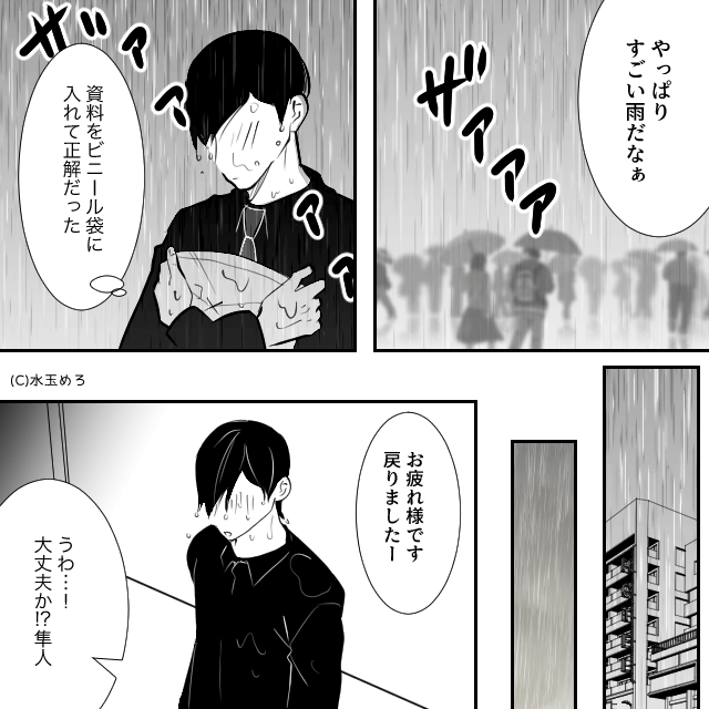 課長と言い合いをしても無駄だと感じた主人公は、大雨の中、取引先へ行くことに決めます。 すると課長が雨に濡れたほうが誠意が伝わるからという理由で、傘の使用を禁止してきました。