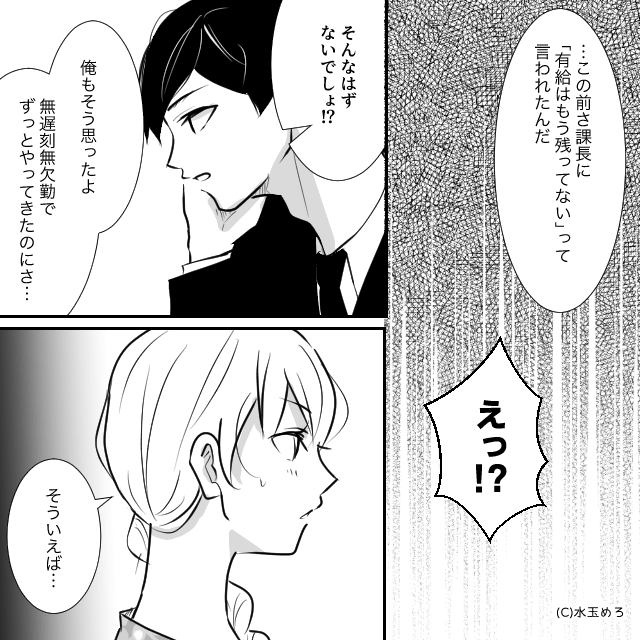 今回は『部下に濡れ衣を着せるモラハラ課長が青ざめたワケ』を紹介します。 有給は残っていないと課長に言われ、欠勤扱いにされてしまった主人公。 課長と関わると面倒なことになると感じ、主人公は「俺も関わらないようにしよう」と決めるのでした。