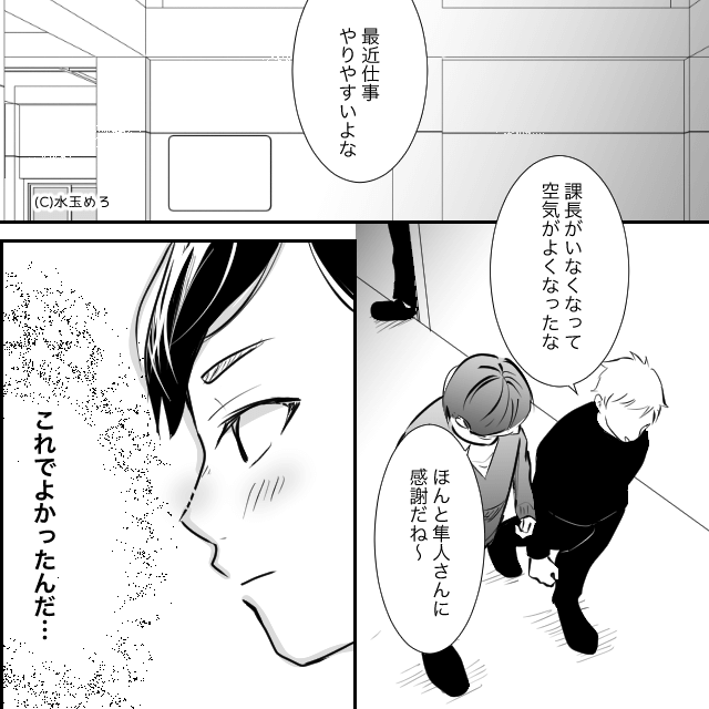 その後、課長は居づらくなり、会社を退職。 主人公は社長である義父との関係が広まり「俺、この会社にいていいのかな…?」と悩みます。