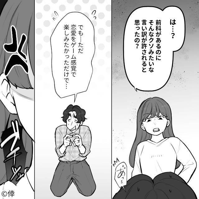 メッセージのやり取りを確認したところ、夫の発言は事実のようで…。 主人公が「嘘はついてないね」と言うと、開き直った夫は「恋愛をゲーム感覚で楽しみたかっただけで…」と言い訳をしたのでした。