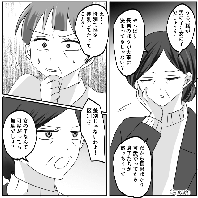 今回は『「女の子なんて可愛がっても無駄」孫差別を繰り返した義母の末路』を紹介します。 自覚なく、息子と娘を性別で差別していた義母。 夫に冷たく突き放され、義母は逆ギレをして帰っていったのでした。