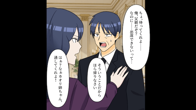 今回は『結婚式で…新婦の”父”が欠席したまさかの理由』を紹介します。 誰からも相手にされず絶望していたときに義姉が現れ、ホッとする夫。 しかし義姉にも「席、ないわよ」と言われてしまい…。