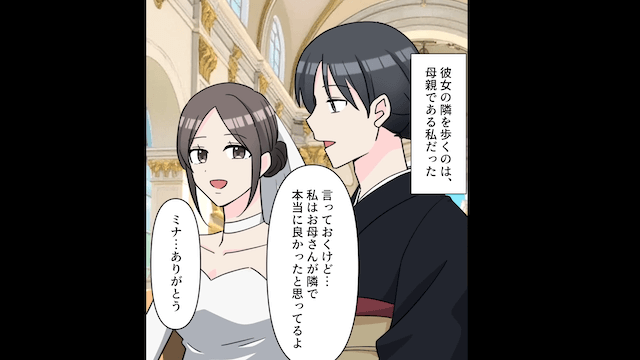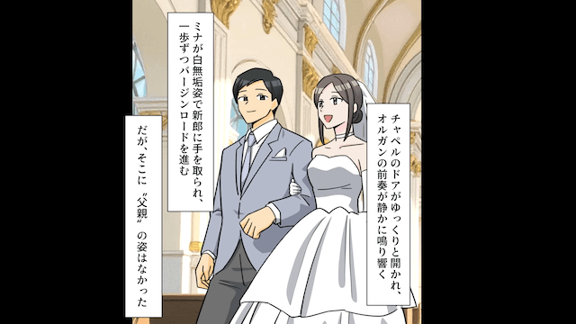 夫は必死に言い訳をしますが、どうすることもできず、ガラスの向こう側にいる娘を見ながら落胆します。 一方、主人公は夫の代わりに、娘とバージンロードを歩いたのでした。