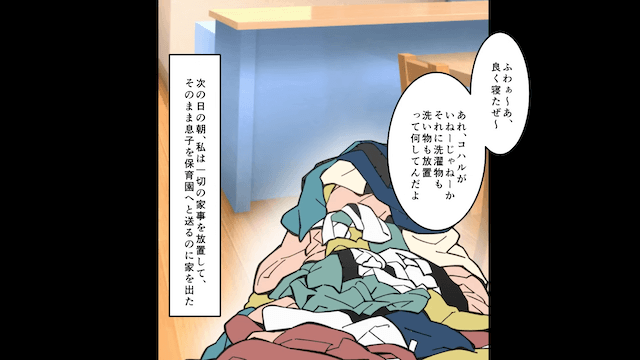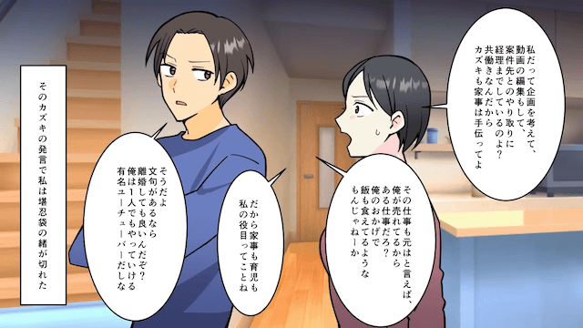 人気配信者になったことで調子に乗った夫は家事をしなくなり、不満を言う主人公に「離婚してもいいんだぞ?」と言ってくるようになりました。 そんな夫に我慢の限界を感じた主人公は、家事を放置して家を出て…。