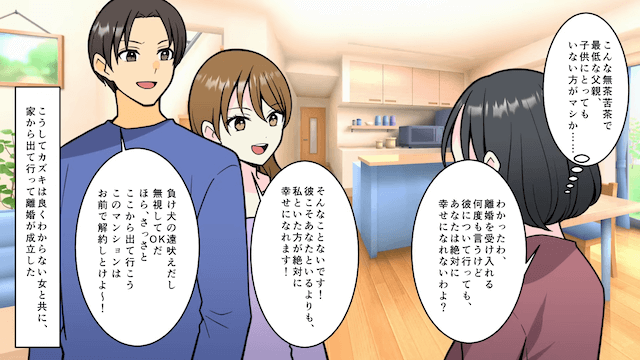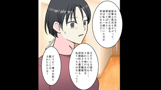 主人公に追い詰められ、浮気相手とはもう会わないと約束した夫。 しかしその後、夫は約束を守らず、浮気相手が妊娠したからと離婚を突きつけてきたのです。