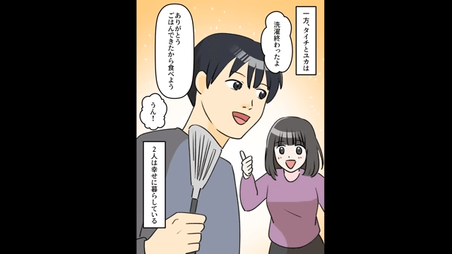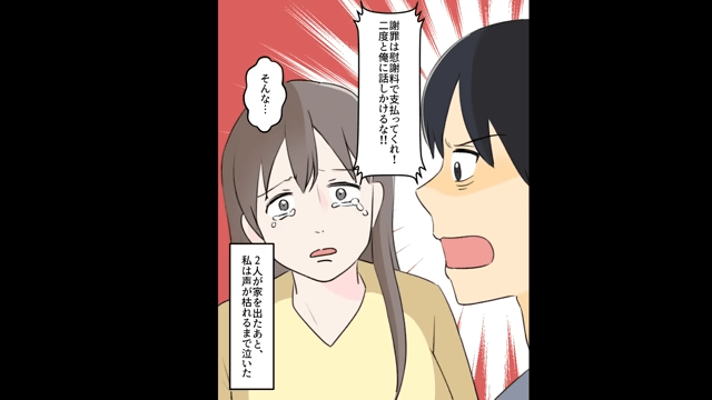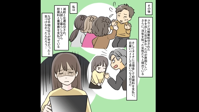 主人公は減給と左遷処分になり、1人で寂しく暮らしながら慰謝料と養育費を支払うことに。 そして主人公と離婚した夫は、娘と2人で幸せに暮らすのでした。