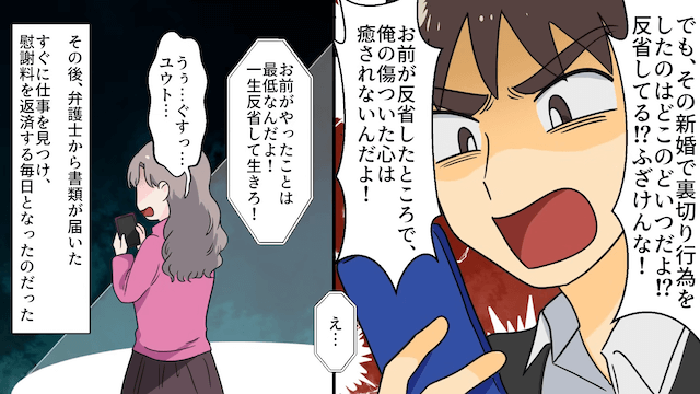 主人公が「金欲しさに浮気しちゃっただけ!」と説明すると、夫は「俺との結婚も俺の年収しか見てなかっただろ?」と言いました。 そして夫は慰謝料を請求し「一生反省して生きろ!」と主人公を突き放したのです。