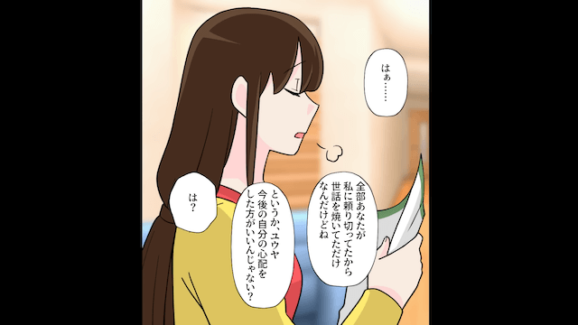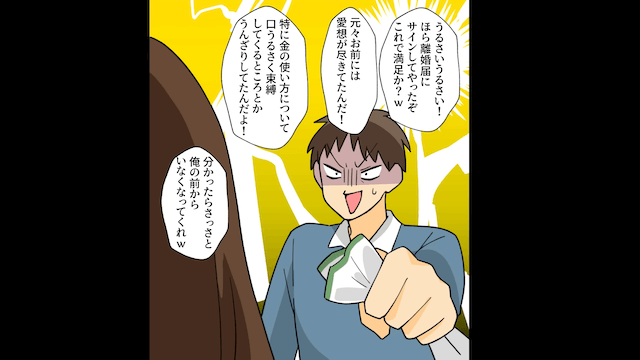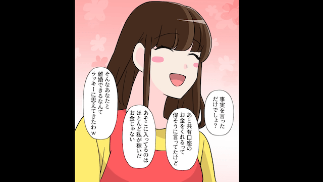 そして「お前は今日から住む場所すらない転落人生ってわけ」と主人公を笑うのですが、主人公は自分の収入があるためなにも困らないことを夫に伝えるのでした。