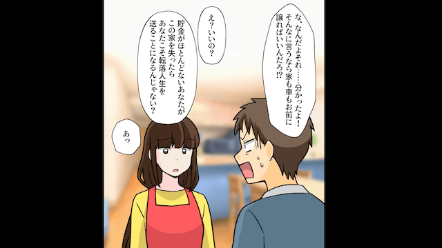 ローンの支払い義務が自分にあると知り「そんなの無理に決まってる!」と嘆く夫。 そして「家も車もお前に譲ればいいんだろ!?」と叫びますが、家を手放せば自分の居場所がなくなることに気づきます。