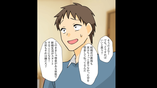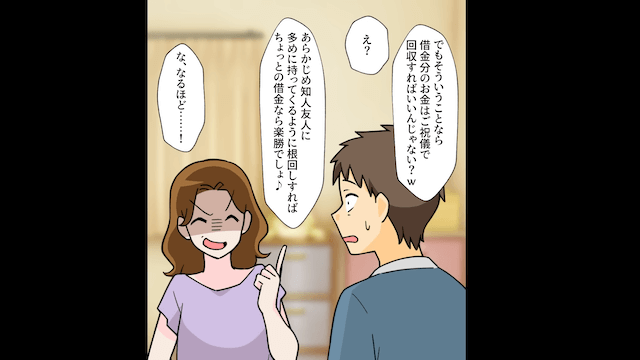 すると浮気相手は「借金分のお金はご祝儀で回収すればいいんじゃない?」と提案してきたのでした。