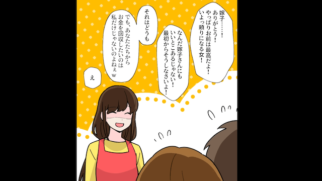 頭を下げるだけで今までの悪事を許してもらえると思っている夫と浮気相手に呆れ果て、慰謝料の請求を取り下げると約束した主人公。 その言葉に2人は喜びますが、主人公は「あなたたちからお金を回収したいのは私だけじゃないのよねぇ」と告げます。