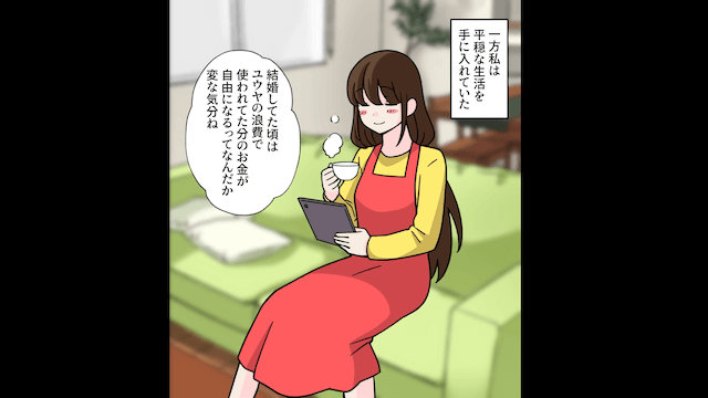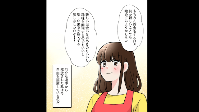 夫は詐欺の罪で捕まり、浮気相手は借金取りに捕捉されて借金を返す日々を送ることに。 そして主人公は平穏な生活を手に入れ、自由を謳歌するのでした。
