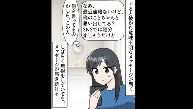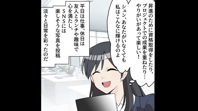婚約者が女性と2人きりで食事をしていることを知った主人公は、婚約者と距離を置くことにします。 そして平日は仕事に没頭し、休日は友人と楽しく過ごしていると、婚約者からメッセージが届きました。