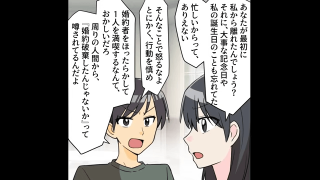 今回は『産婦人科で再会した元夫「婚約者が妊娠した(笑)」私「あんたの子じゃないよ(笑)」⇒真実を伝えた結果』を紹介します。 婚約者の態度が冷たくなってしまったため、距離を置くことにした主人公。 そんなある日、婚約者から何通もメッセージが届き…。