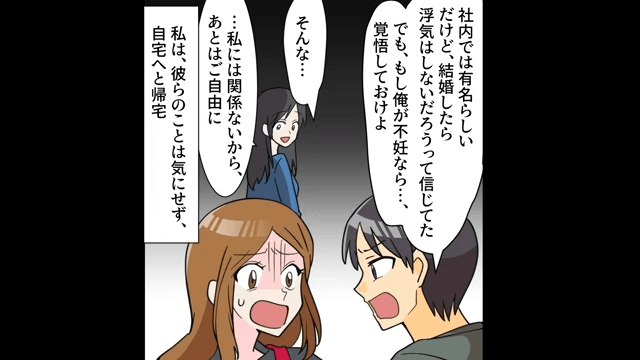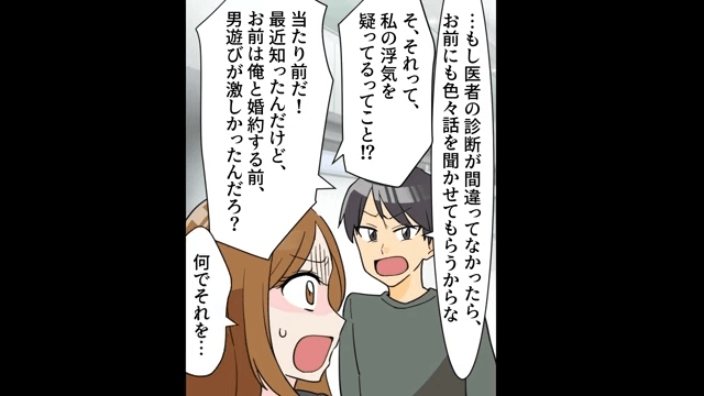 婚約者は浮気相手に「…もし医者の診断が間違ってなかったら、お前にもいろいろ話を聞かせてもらうからな」「もし俺が不妊なら…覚悟しておけよ」と言いました。 そして主人公は、そんな2人のことを気にせず帰宅したのです。