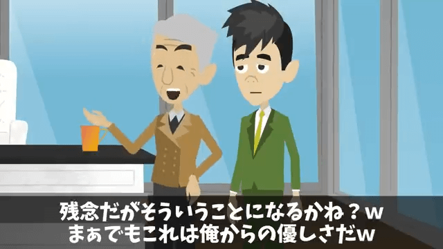 今回は『大切な商談当日空港で…上司「今日は中卒のバカを連れて行かない(笑)」しかし2時間後⇒上司からSOS!?』を紹介します。 定年まで主人公の雑用係でも構わないと話す上司に、社長は主人公との契約が5年であることを話しました。 そして社長は、さらに歳をとってしまう前に新しい職場を探したほうがいいと上司に言い…。