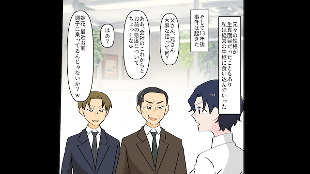 そして主人公は経営の中枢に食い込むのですが、13年後、父と兄に調子に乗っていると言われてしまい…。