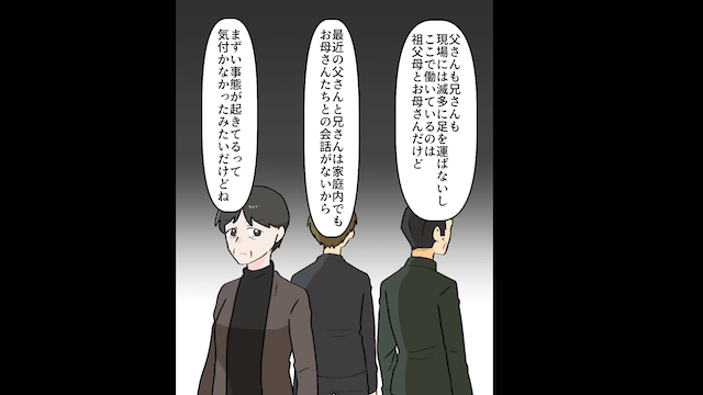兄が悪巧みを始めた翌朝、母に店に呼び出された父と兄は、店が真っ暗なことに気づきます。 そこに主人公が現れ、1週間前から社員たちがストライキを起こしていることを報告。