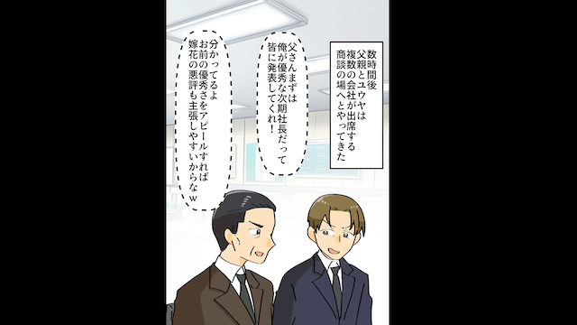今回は『家業に尽くした私に…父「社長は長男に任せる!」⇒私「じゃあ、会社と娘辞めます」父「は?」』を紹介します。 主人公の転職や職人たちの引き抜きを阻止するため、商談で主人公の悪評を流そうと企んだ父と兄。 その企みに気づいた主人公は、抗戦することに決めたのでした。
