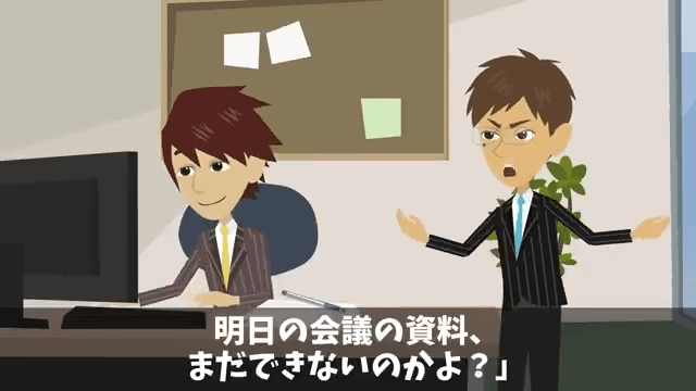 上司から「明日の会議の資料、まだできないのかよ?」と聞かれた主人公は、今最終チェックをしているところだと答えました。 すると上司が「最終チェックって。そんなの必要かあ?」と言い出し…。