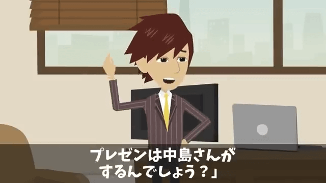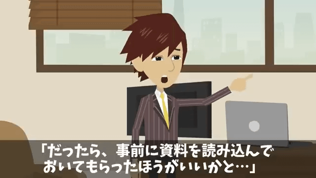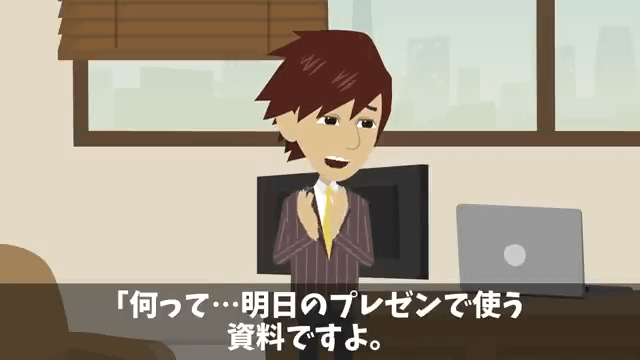 主人公は上司に「これ、先にお渡ししておきます。確認しておいてください」と言い、資料を渡しました。 すると上司が「は?なにこれ?」と言うため、主人公は明日のプレゼンで使う資料だと説明したのです。