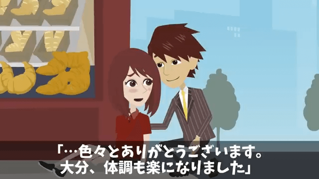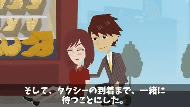 主人公はタクシーが到着するまで、女性のそばで待つことにしました。 すると女性が「…いろいろとありがとうございます。だいぶ、体調も楽になりました」と言い、主人公は安心して…。