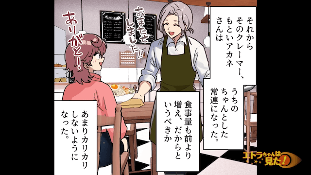 今回は『カフェで…女性客「何この料理!?」⇒”謎クレーマー”に絡まれた話』を紹介します。 無理なダイエットをしていた女性客に「しっかり食べてください」と伝えた主人公。 すると女性客は涙を流しながら「ええ…ありがとう…」と言ったのでした。
