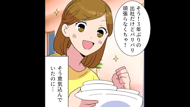今回は『産休明けで夫と同じ会社に復帰したら…夫「パート頑張れ(笑)」私「何言ってるの?」⇒正体を明かした結果』を紹介します。 娘が幼稚園に通うようになり、子育てが一段落したとホッとする主人公。 職場復帰も決まり、主人公は夫に家事の協力を求めたのでした。