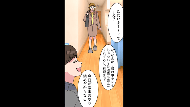その日、主人公が帰宅すると家事が完璧に終わっており、夫が「今日が家事のやり納めだからな」と言ってきて…。
