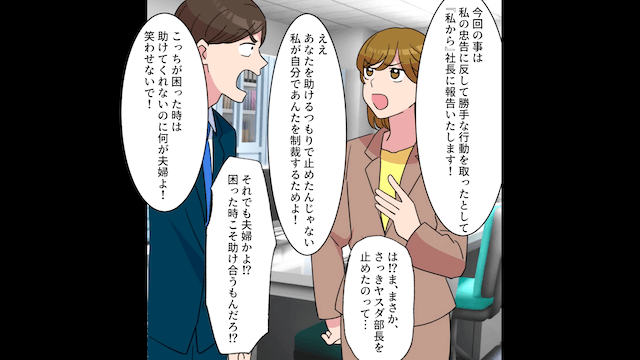 夫はその場にやってきた主人公に助けを求めました。 しかし主人公は夫に激怒しており、自分で夫に制裁を下すために、あえて担当者を止めたのだと言ったのです。