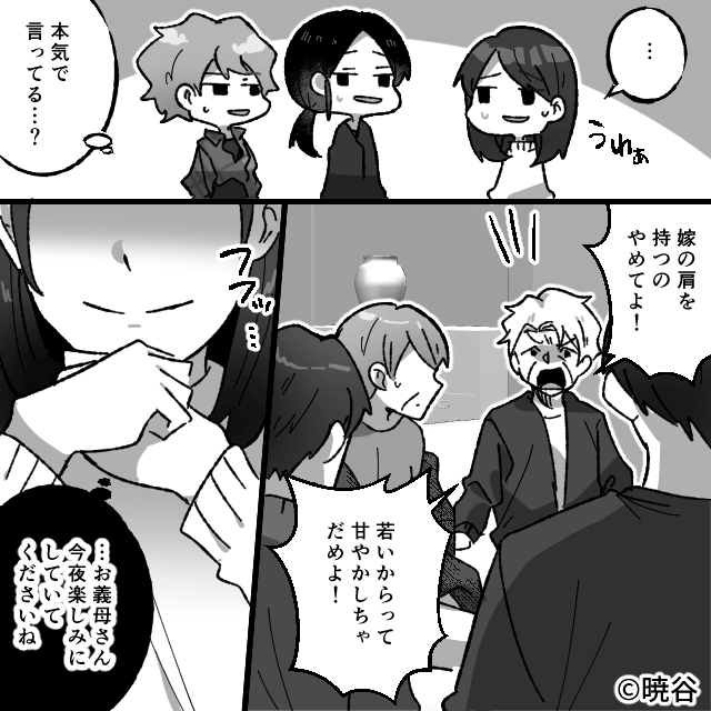 義母が懲りずに悪口を言い続けると、親戚は主人公たちを庇ってくれます。 そして嫁いびりだと指摘されるのですが、義母は「私のは教育よ!」と反論するのでした。