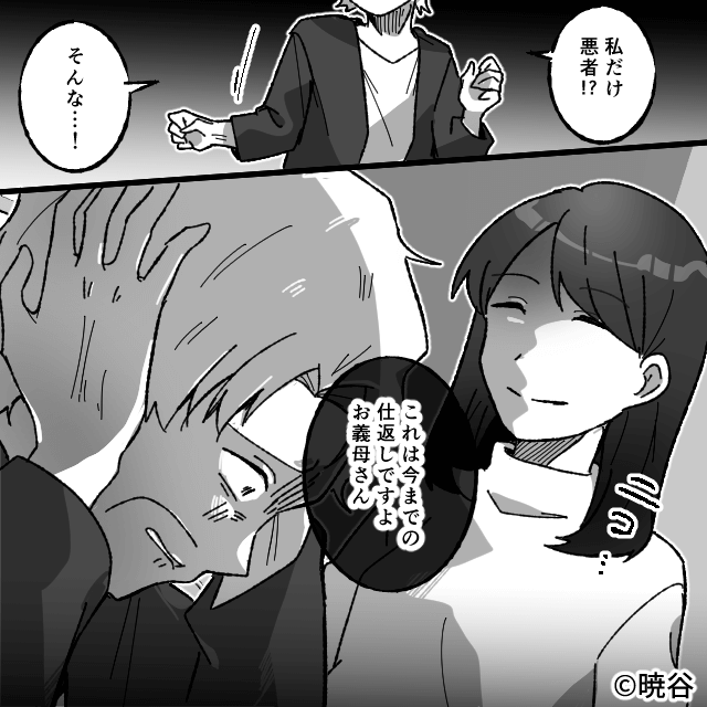 義母は「いい加減にして!」と怒って、夫たちに助けを求めますが、夫たちにも責められてしまい…。 味方がいないことに気づいた義母は、ショックを受けてその場から逃げ出したのでした。
