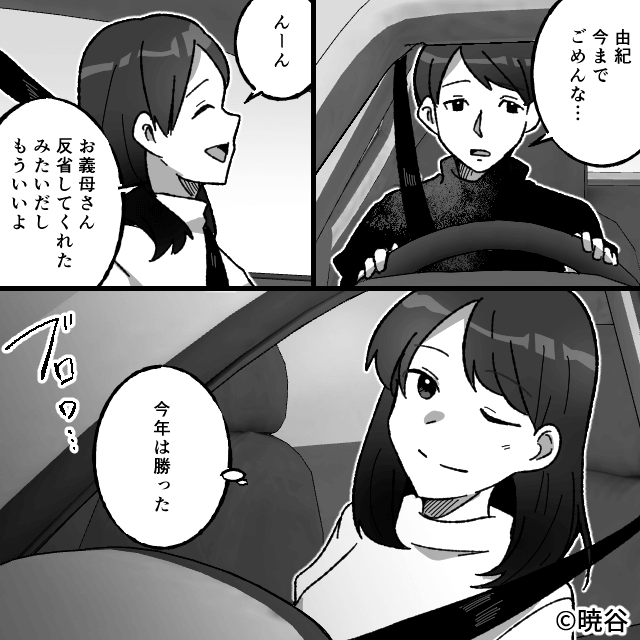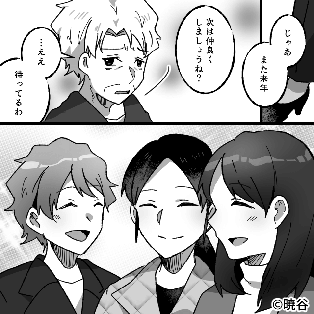 次の日、反省した様子の義母は「…来年は気をつけるわ」と言います。 主人公はホッとして「次は仲よくしましょうね?」と義母に伝え「今年は勝った」と心の中で喜ぶのでした。