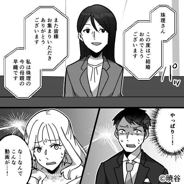 今回は『前妻と比べて私を見下す夫と継子の末路』を紹介します。 式場スタッフが「新婦のお母様からサプライズムービーが届いております」と言ったため、前妻からのサプライズかと思った夫。 前妻が「私じゃないわよ!?」と言うと、夫は「まさか…」と慌て出したのでした。