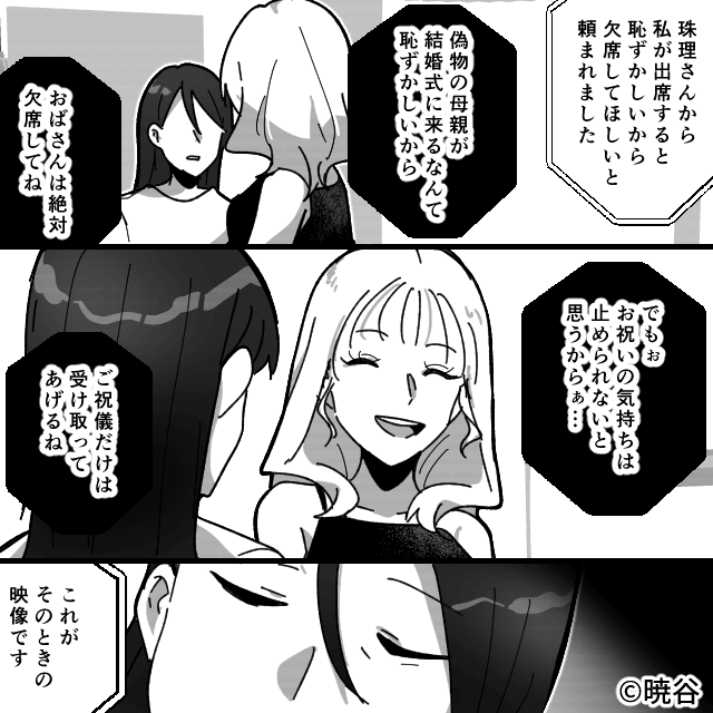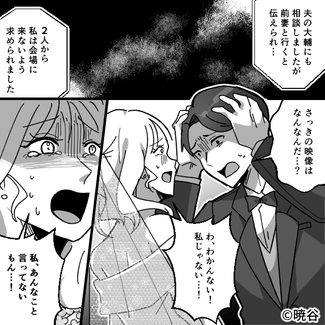 今回は『前妻と比べて私を見下す夫と継子の末路』を紹介します。 主人公からのサプライズムービーが流れ、焦る夫と娘。 主人公は、式に出席できなかった理由を語り始めて…。